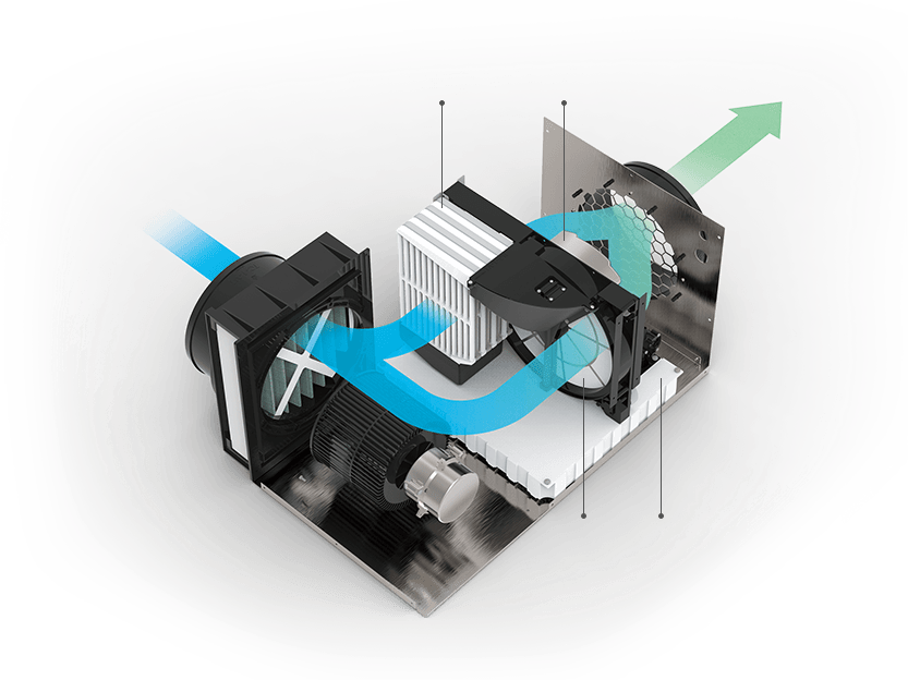 Closed concept design is not bound by the limitations of the more common upright dehumidifiers. The limitations come from the need to minimize footprint, in turn sacrificing efficiency. Our system forgoes front and back design of desiccant rotor and heat exchanger. This novel parallel design allows for an even flow of cold moist air into both the desiccant rotor and the heat exchanger, which results in faster dehumidification and reduces wind drag, improving dehumidification efficiency.